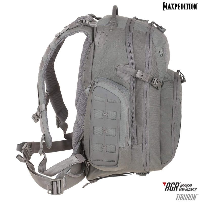 Дизайн 34-литрового рюкзака Maxpedition Tiburon предусматривает полностью раскрывающиеся основное отделение, внутри которого предусмотрен чехол под питьевую систему или ноутбук и один сетчатый карман общего назначения, фронтальное отделение-органайзер и небольшой карман в верхней части, а также два боковых утилитарных отделения и карман на дне рюкзака, рассчитанный под дождевик.
