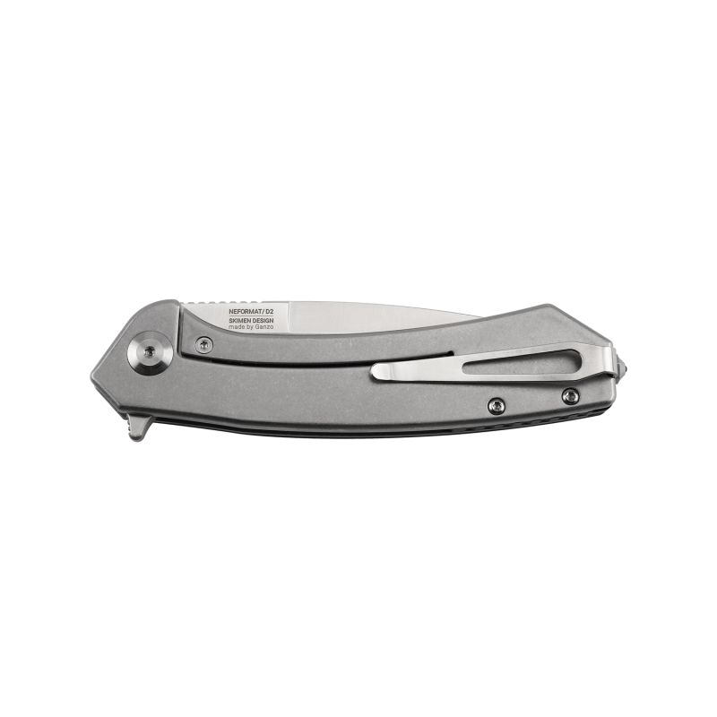 В основе ножа – сверхпрочная, износостойкая сталь марки D2. Защищённый от коррозии металлический сплав демонстрирует высокие показатели твёрдости. Значение твёрдости у ножа – порядка 60 единиц по шкале Роквелла, что очень хорошо для данного вида продукции. Тип заточки – прямой. Длина клинка составляет восемь с половиной сантиметров, толщина – три с половиной миллиметра. Модель складная, лезвие извекается при помощи удобного замка Flipper. Skimen надёжным образом защищён от случайного открытия либо закрытия. Он безопасен в применении, и имеет простую конструкцию. Общая длина изделия всего 20,5 сантиметра. Такие компактные габариты дают преимущество ножу для применения каждый день. Его можно запросто положить в сумку либо карман, и применять по необходимости, модель всегда под рукой.