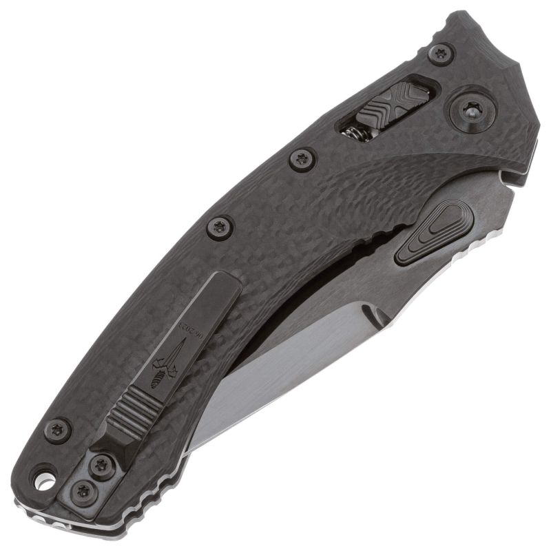 Клинок формы drop-point с слегка изогнутой режущей кромкой и вогнутыми спусками выполнен из порошковой хромистой стали M390 с крайне агрессивным резом. На спусках клинка глянцевое покрытие DLC Diamondwash, его хищный блеск прекрасно сочетается с опасным изгибом клинка. На голомени чёрное покрытие матовое, что создаёт выгодной контраст. Обух заточен на 2/3, также на обухе у рукояти имеется крупное рифление для дополнительного комфорта во время выполнения силовых или точных работ. Раскрытие происходит при помощи крупного ступенчатого двухстороннего шпенька, расположение которого идеально для молниеносного извлечения клинка. За фиксацию ножа в открытом положении отвечает замок Ram-Lock - это версия замка Crossbar Lock от Microtech с винтовой пружиной. Замок двухсторонний, что позволяет с комфортом пользоваться им как правшам, так и левшам