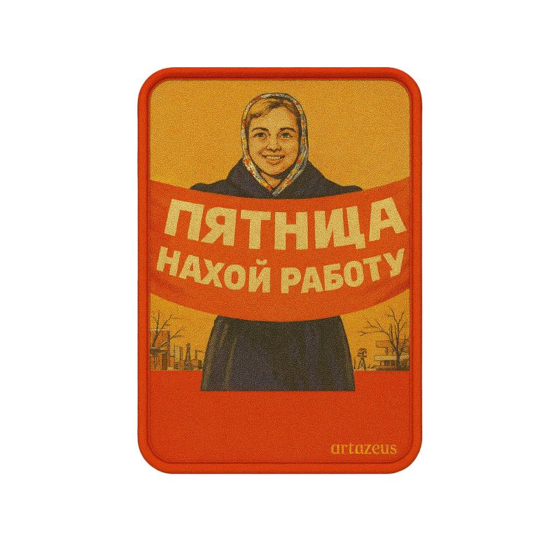 Ироничный и дерзкий патч, обыгрывающий мем о пятнице. Весёлая колхозница с плакатом напоминает, что даже в пятницу можно найти повод для продуктивности. Отличный выбор для любителей юмора и стиля ретро.