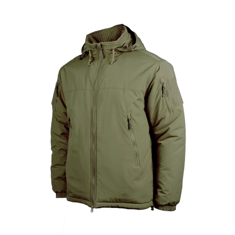Натуральный утеплитель обладает выраженными гидрофобными свойствами. Это гарантирует тепло и комфорт при разнообразных (даже самых суровых) условиях внешней среды. Внешний слой из нейлона обеспечивает абсолютную носкость и защиту внутренних слоев. Ноу-хау данной тактической куртки является использование плетения типа RipStop (клетка) при этом основное волокно ткани переплетается армирующим каркасом из более прочной и большей по диаметру нити. Капюшон позволяет использовать каску или шлем. Благодаря использованию высококачественного нейлона куртка прекрасно переносит упаковку в компрессионный мешок (поставляется в комплекте).