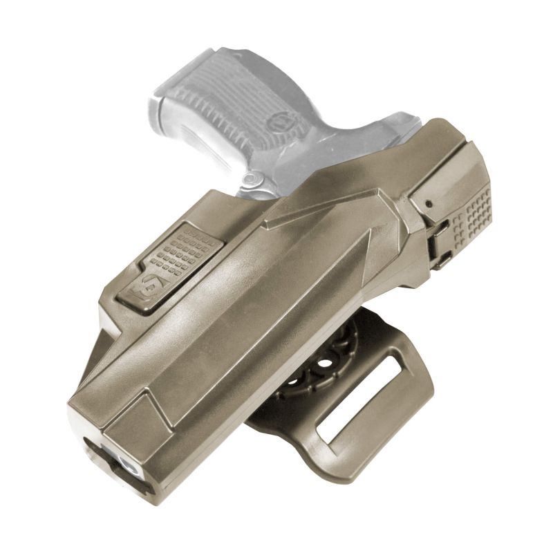 Наличие второй точки фиксации позволяет более надежно удерживать пистолет в кобуре, что защищает владельца от несанкционированного извлечения оружия. С другой стороны, наличие дополнительной точки фиксации не мешает быстро извлекать пистолет. Для этого достаточно одним щипковым движением большого и указательного пальца одновременно нажать на рычаг и кнопку удержания.